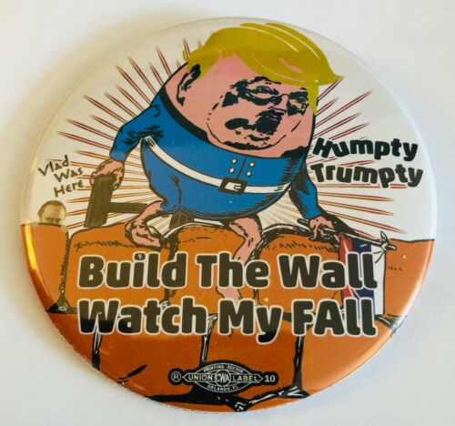 Title (ebay affiliate link): 3" Anti-Trump "Humpty Trumpty Build My Wall Watch My Fall" Political Pinback