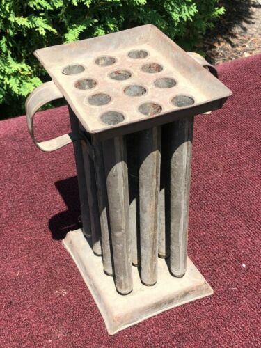 ANTIQUE TIN 12 SECTION CANDLE MOLD 4 ROWS OF 3 AND 2 LARGE STRAP HANDLES
