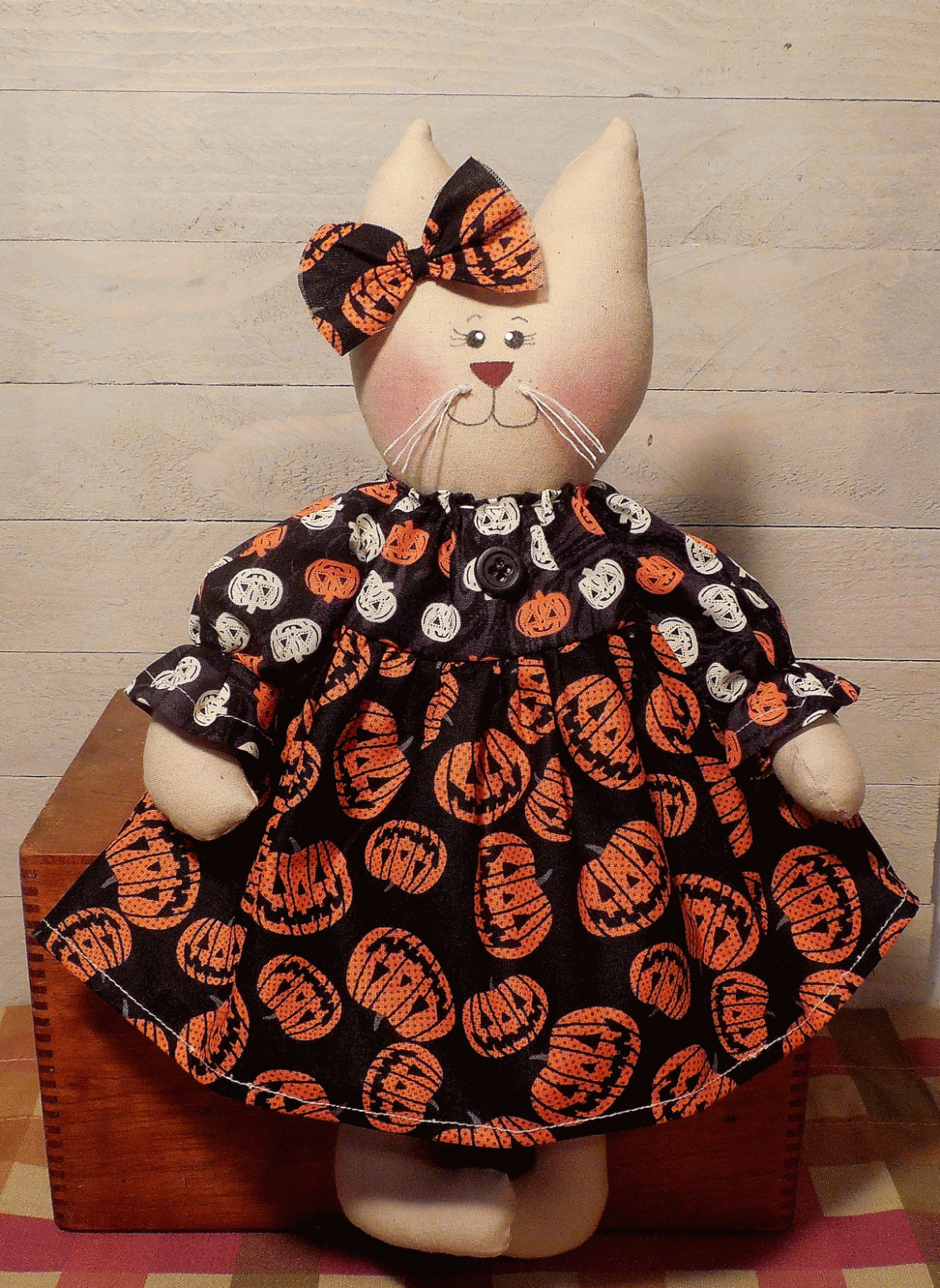 Title (ebay affiliate link): PRIMITIVE HANDMADE HALLOWEEN RAGGEDY Kitty CAT Pumpkins Doll Shelf Sitter
