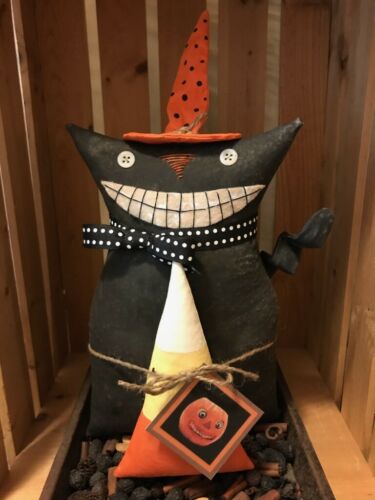 Primitive Halloween Black Cat Shelf Sitter Grin Orange Hat Candy Corn