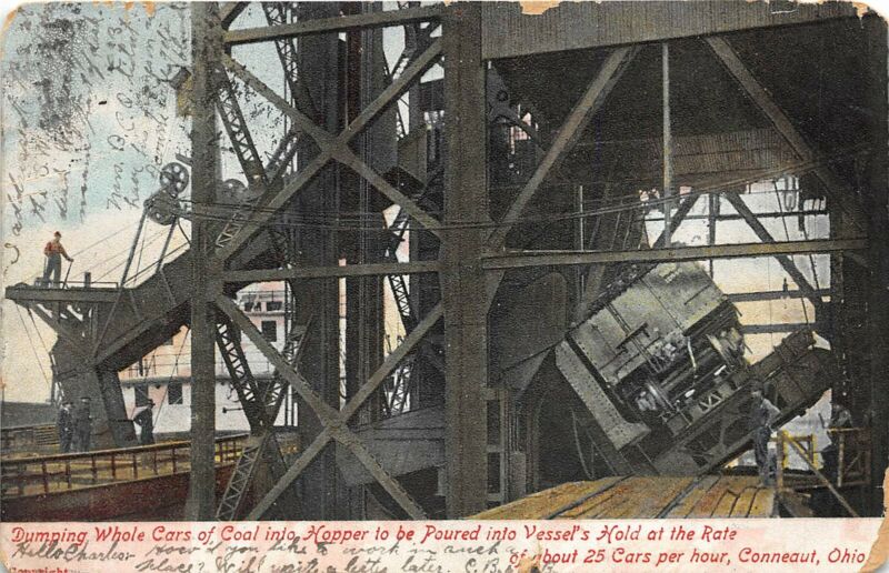 Conneaut Ohio c1906 Postcard Dumping Whole Cars Of Coal Into Hopper
