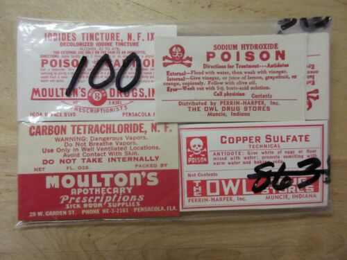 WHOLESALE LOT = 100 OLD POISON = 4 DIFFERENT - PHARMACY-MEDICINE BOTTLE LABELS