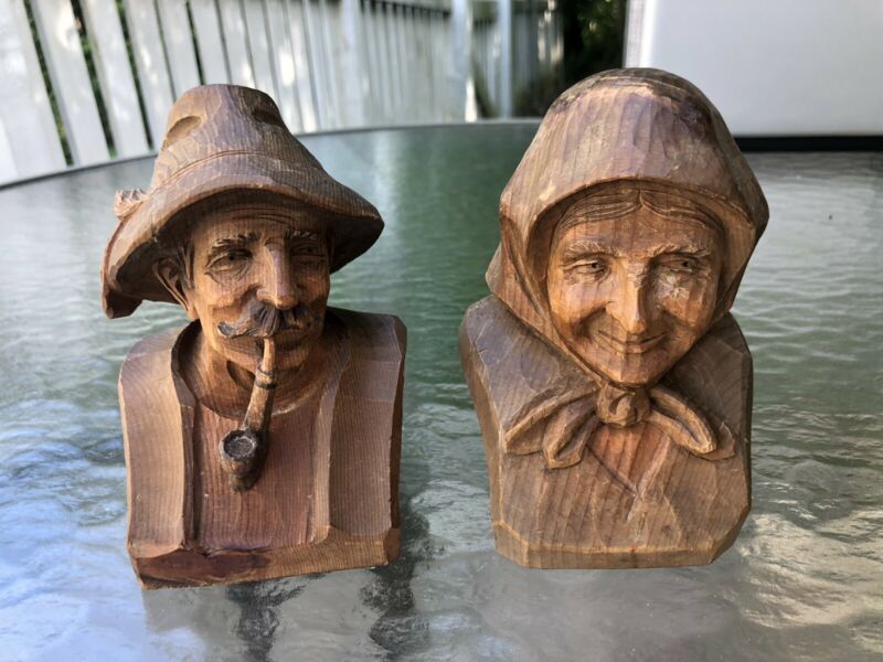Title (ebay affiliate link): Antique Wood Carved Bust Sculptures Black Forest Old Man w Pipe & Woman Germany