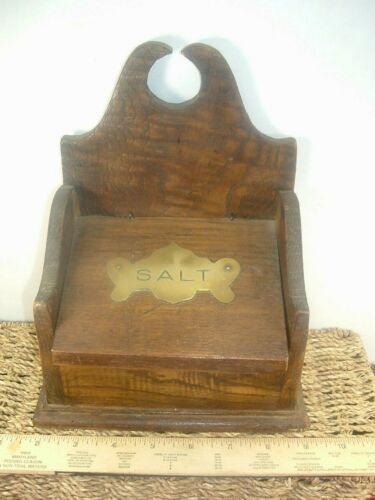 VINTAGE WOOD SALT BOX BRASS TAG HINGED LID