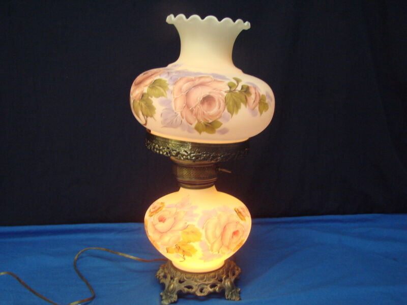 Beautiful Vintage Blooming Rose Pink & Lavender Hurricane Table Lamp Milk Glass