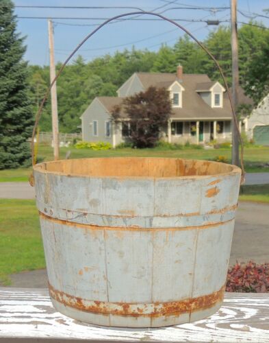 Title (ebay affiliate link): Antique Primitive Wood Sugar Bucket w. Swing Handle in Old Gray-Blue Paint, AAFA