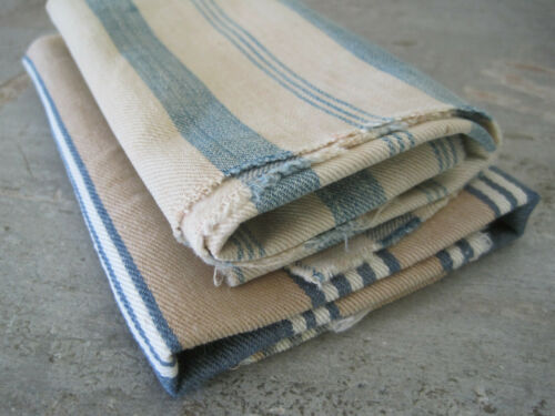 Title (ebay affiliate link): Two Pieces Old Brown Blue White and Blue Cream Ticking Fabric Textile AAFA