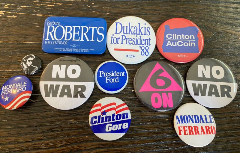 Title (ebay affiliate link): Lot Of Vintage NO WAR Presidential Campaign Pinback Buttons DUKAKIS Clinton Misc