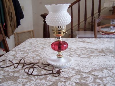 VINTAGE CRANBERRY/HOBNAIL MILK GLASS LAMP 13-1/2" TALL