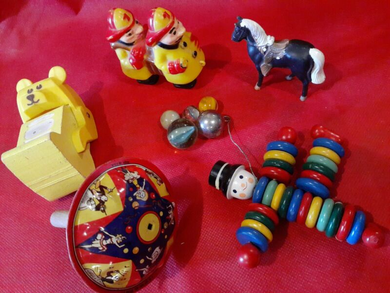Lot of Vintage Toys Dating From 1935 clown, bear, firemen,dicast horse, marbles,