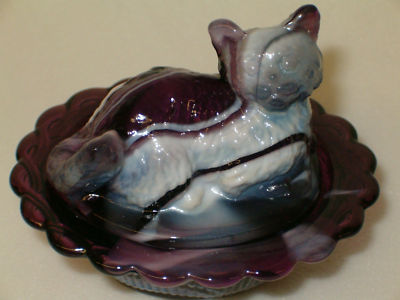 PURPLE & MILK SLAG GLASS CAT KITTEN ON NEST BASKET SALT