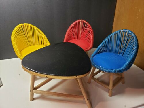 AWESOME MID CENTURY MODERN MINIATURE SIZE FURNITURE TABLE AND CHAIRS RATTAN BACK