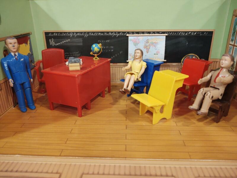 Title (ebay affiliate link): Renwal SCHOOLHOUSE w/TEACHER and STUDENTS Vintage Miniature Dollhouse Furniture