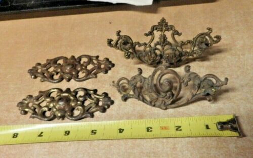 LOT OF 4 ANTIQUE BRASS FURNITURE ADORNMENTS FLORAL LEAVES / DRAWER PULL FILLIGRE