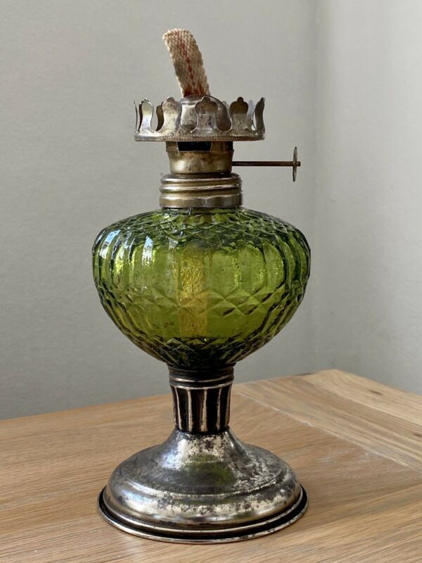 Title (ebay affiliate link): Small Vintage Paraffin / Oil Lamp With Green Cut Glass Reservoir