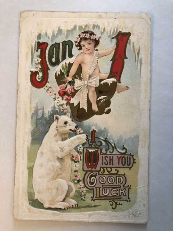 Title (ebay affiliate link): C. 1911 J. Herman Embossed NEW YEAR Postcard Polar Bear Kid Riding Bell 1912