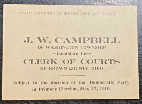 1910 Brown County Ohio Democratic Party Political Card J.W. Campbell Clerk of Co
