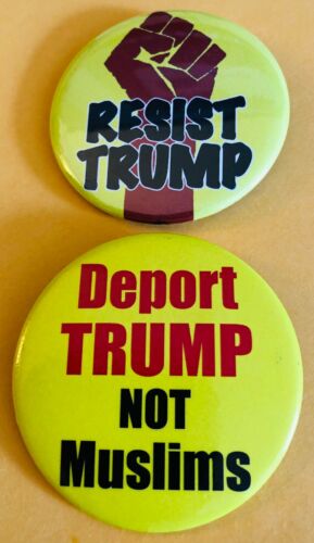 Title (ebay affiliate link): Two 2 1/4" Anti-Trump Political Pinback Buttons for Charity