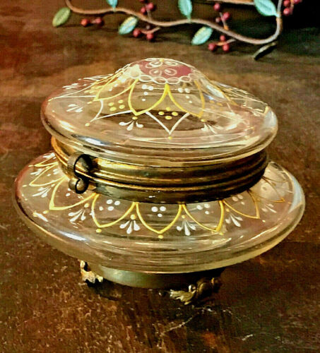 Title (ebay affiliate link): Vintage Depression Glass Hand Painted Dresser Box Hinged Top TLC