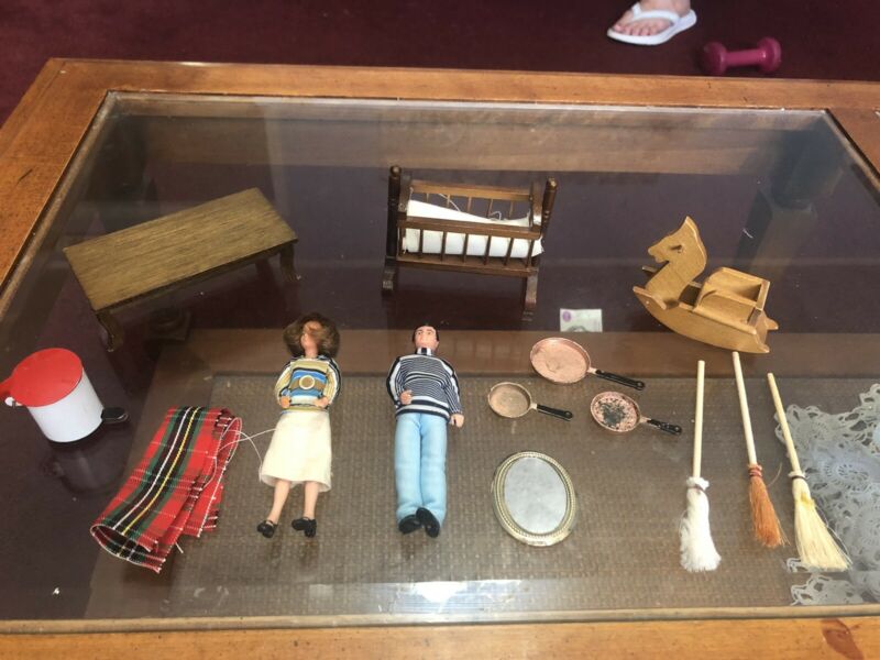 Vintage Dollhouse parts People Trashcan Rocking Horse Baby bed old furniture