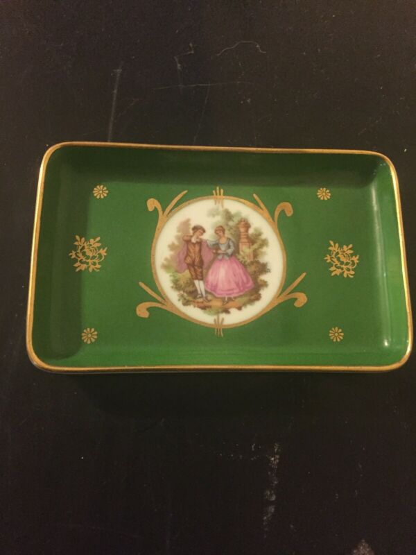 Vintage Antique Limoges France Green& Gold Tray Dresser Plate Trinket Dish