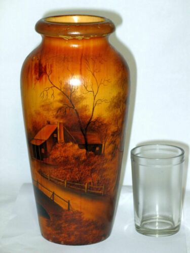 Tall Pokerwork Vase, Cottage Scene with Glass Insert