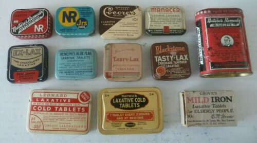 Title (ebay affiliate link): Lot of 11 Different Laxative Tins and 1 Laxative Box Drug Store Medicine
