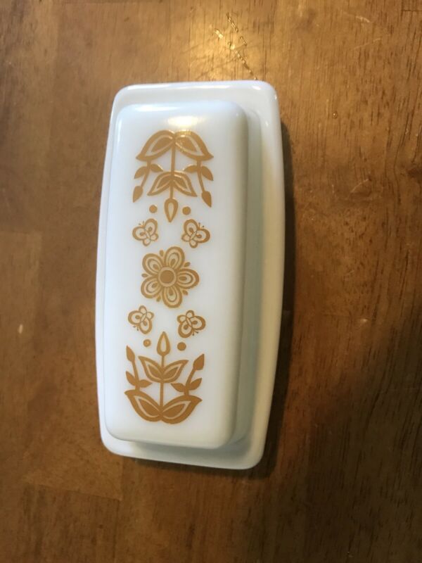 VINTAGE PYREX 2pc. BUTTER DISH, MILK GLASS & BUTTERFLY GOLD