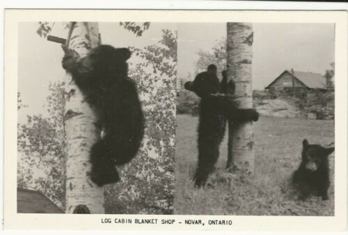 Title (ebay affiliate link): M: Canada Ontario Novar Log Cabin Blanket Shop Black Bear Cubs Vintage Postcard