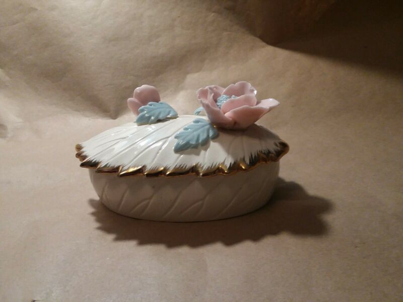 Title (ebay affiliate link): Vintage Capodimonte White Trinket Dish Gold Trim Leaf Shaped Lid Pink Roses