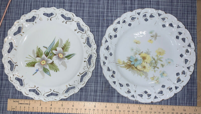 Pair of Vintage Hand Painted Plates Floral Lace Edge