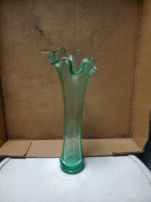Green Depression Glass Single Flower Vase Wavy Top 8 Inches Tall