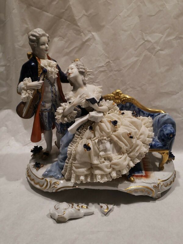 Title (ebay affiliate link): BROKEN Large 11" Antique Dresden Romantic Couple Man Woman Sitting Figural