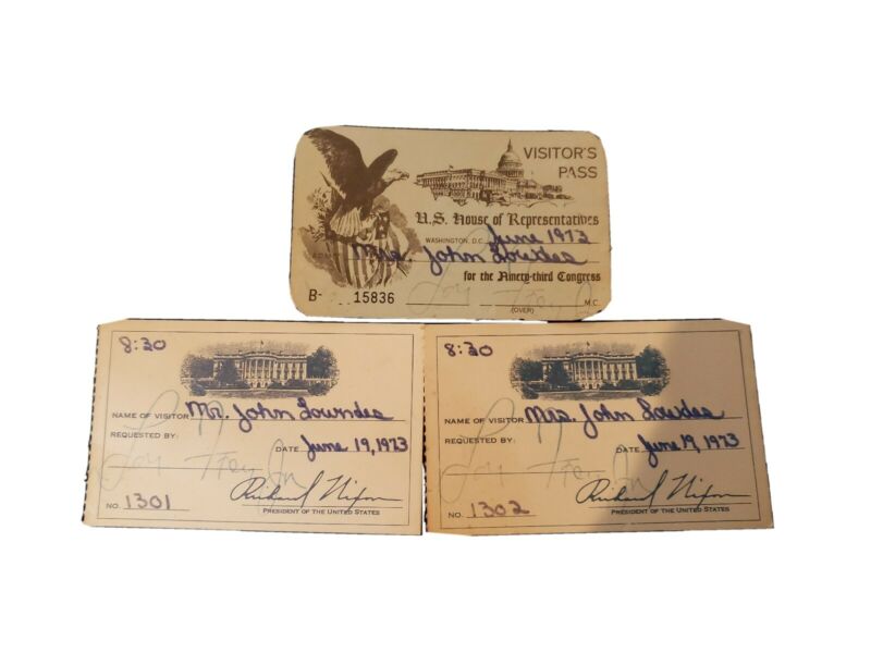 Title (ebay affiliate link): 1973 Visitor Guest Pass White House Tickets Richard Nixon & House of Rep.s