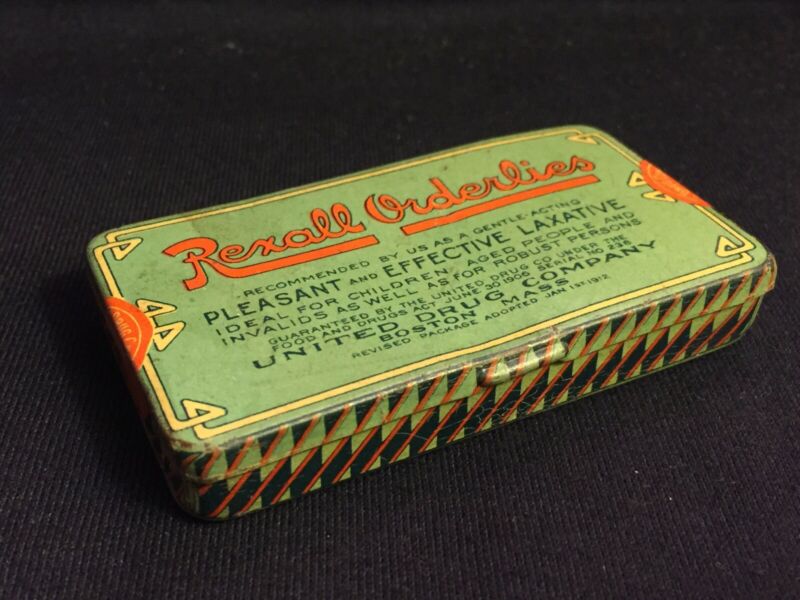Title (ebay affiliate link): Antique RARE 1912 Version Rexall Orderlies Laxative Tin Boston Mass. United Drug