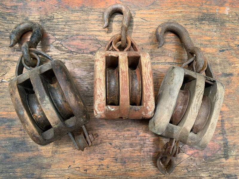 Title (ebay affiliate link): Lot of 3 Vintage Nautical Mixed Wood Iron Pulleys Hook Block Tackle Farm Barn