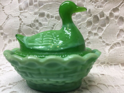 Title (ebay affiliate link): Green milk Jadeite glass salt cellar celt duck on nest basket dip swan dish jade