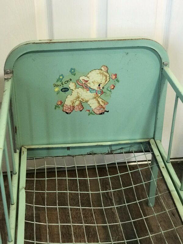 Title (ebay affiliate link): Doll Crib Vintage Aqua Blue Metal Doll-E-Crib Bed by Amsco Drop Side Rail 1950s