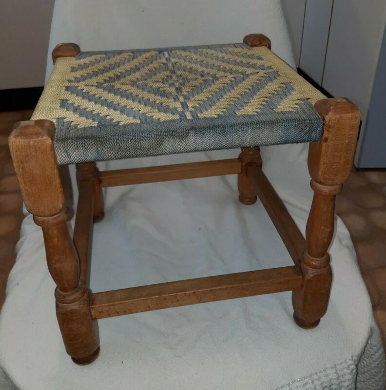 Title (ebay affiliate link): Vintage Retro Wooden Foot Stool with Blue & Yellow Woven String Seat.