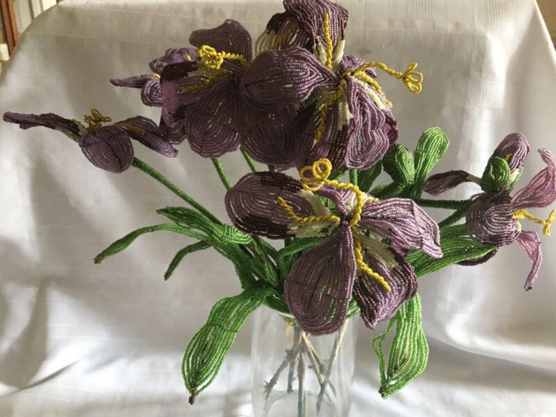 Antique/Vintage French Beaded Flowers, Purple Iris, 7 Large Stems