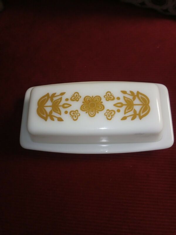 Vintage Pyrex Covered Butter Dish Butterfly Gold Floral Milk Glass IMMACULATE