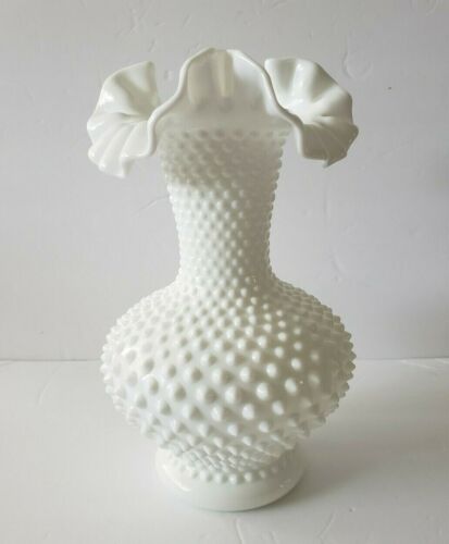 Title (ebay affiliate link): Vintage Fenton Hobnail Ruffled Edge Milk Glass Vase 11" #3752