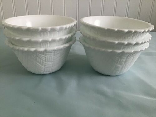 Title (ebay affiliate link): Set of 6 Opaque Milk Glass Berry Dessert Bowls Basket Weave w Ruffled Rims EUC