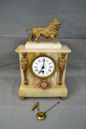 Antique Alabaster Mantel Clock with Brass Lion on Top Key & Pendulum