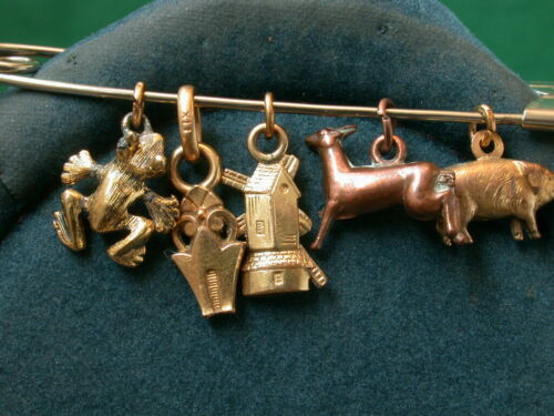 Title (ebay affiliate link): 5 ANTIQUE DECO GOLD F FIX ANIMAL CHARM PENDANT LOT PIG FROG WINDMILL DEER FLOWER