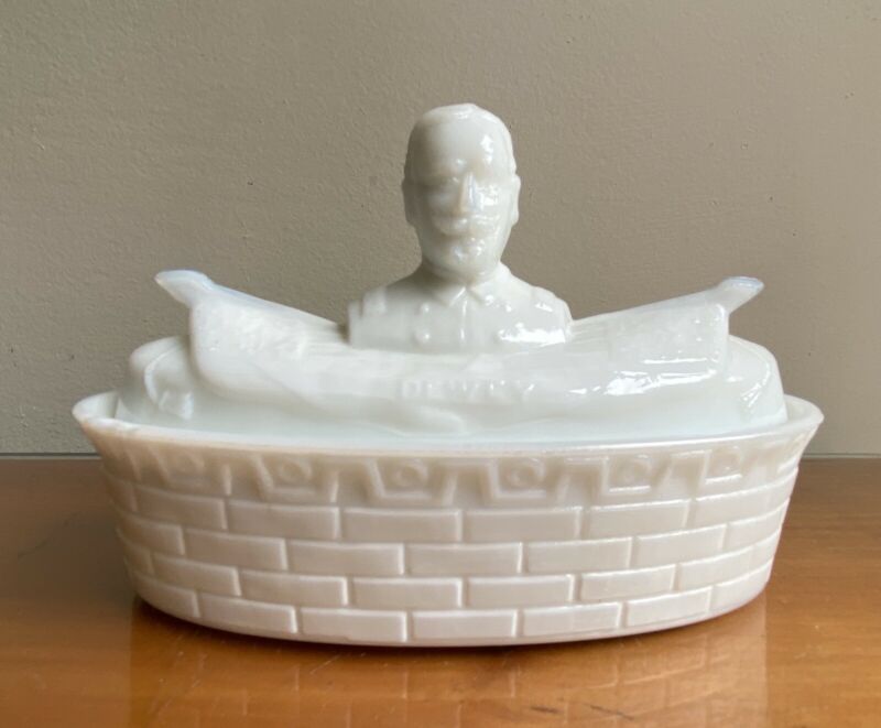 Title (ebay affiliate link): 1890s Flaccus Admiral Dewey Milk Glass~Covered Mustard "Boat"