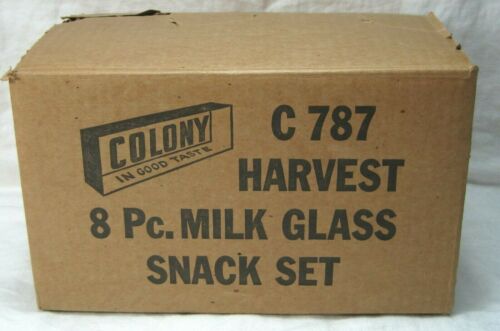 8 pc. vintage NIB OS Colony Harvest grape white milk glass SNACK SET