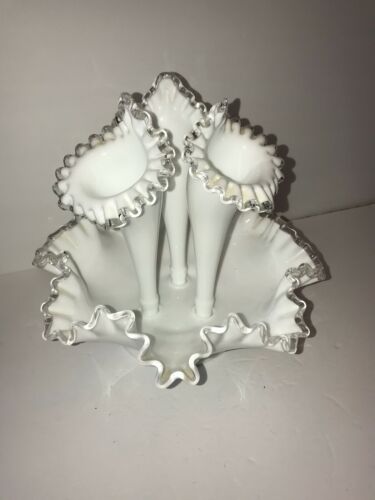 Fenton Silver Crest Vase Epergne Bowl w/3 Horns Milk Glass Clear Ruffle Flowers