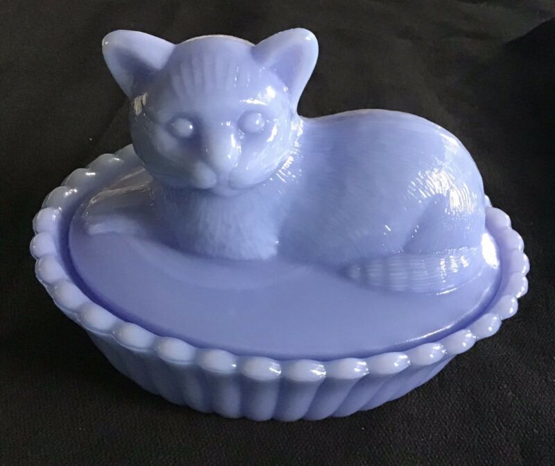 Title (ebay affiliate link): Vintage Westmoreland BLUE MILK GLASS Cat Candy Dish- KITTEN On A NEST
