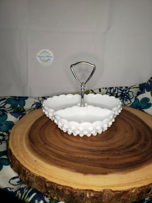 Title (ebay affiliate link): 085 FENTON WHITE MILK GLASS HOBNAIL CLOVER LEAF CANDY DISH w/ CHROME HANDLE